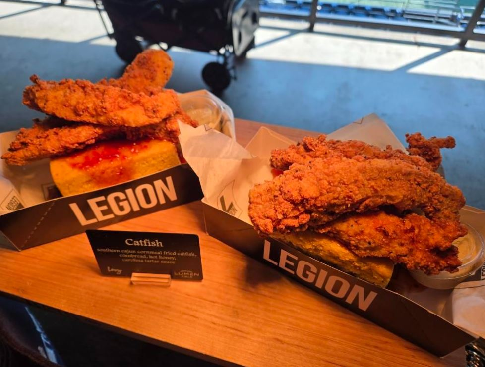You’ve heard of home field advantage, but what about home taste advantage. That’s what you’ll find at Lumen Field as the stadium has teamed up with local names and Seahawks legends to keep hungry fans happy. Two brand-new Legion locations are opening on the Club Level, thanks to a partnership with Kam Chancellor and Richard Sherman’s Legion Sports Bar. On the menu: a smash burger, a fully loaded Legion Sausage with jalapeno cheddar, fried pickles and Carolina tartar sauce, and Southern Cajun catfish with cornbread and hot honey (one of my favorite tastings of the afternoon).